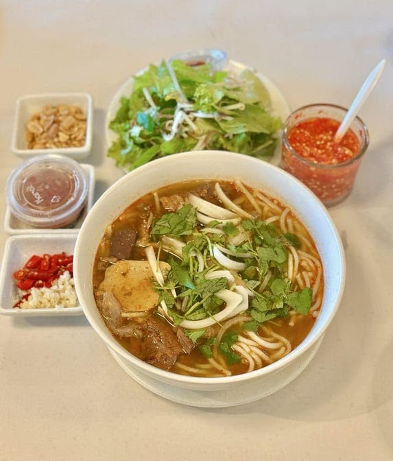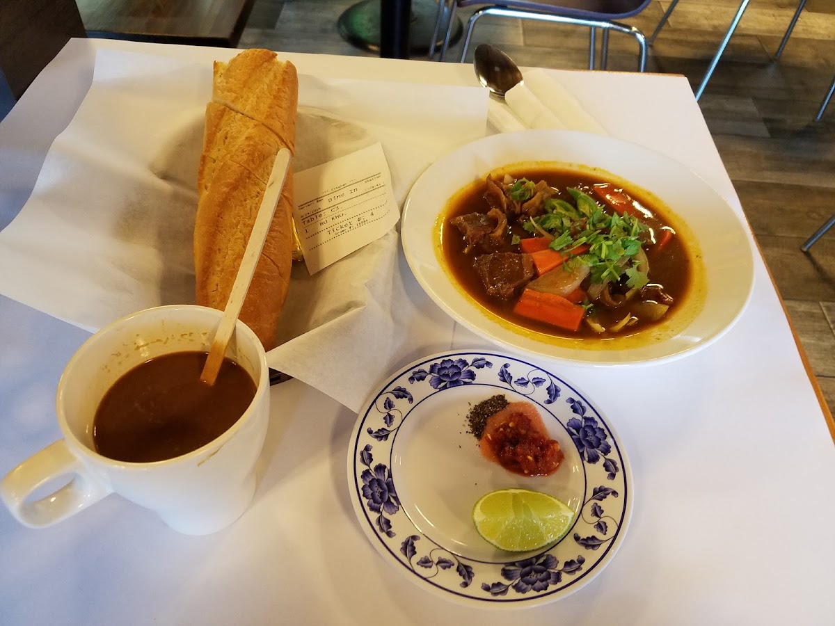 The menu reflects a balance of traditional Vietnamese staples and café favorites. You’ll find hearty options like Bò Kho (beef stew) served with French bread, steak and eggs combos, and various noodle soups including roast pork and wonton egg noodle bowls. On the drinks side, strong Vietnamese coffee features prominently—whether it’s a hot cappuccino, a classic café sữa nóng, or an iced version. Those looking for something lighter can try fruit teas like lychee or fresh salads dotted with filet mignon and avocado.